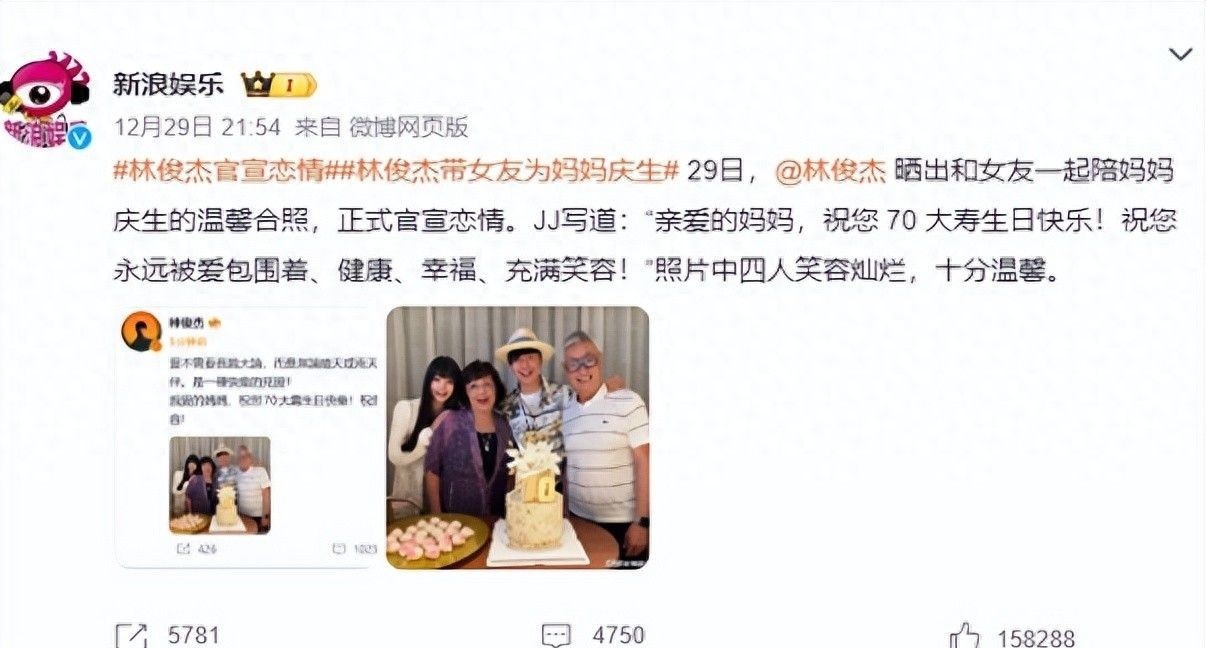 2025年12月29日晚间,林俊杰在个人微博发布温馨动态,配文深情写道:“亲爱的妈妈,祝您七十岁生日快乐。愿您永远被爱环绕、平安喜乐、健康长寿、笑容常驻。”照片中,父母居于正中央,林俊杰站在一侧满脸笑意,而另一侧则是一位年轻女性,自然地将手搭在林母肩上,四人并肩而立,氛围温暖如春。