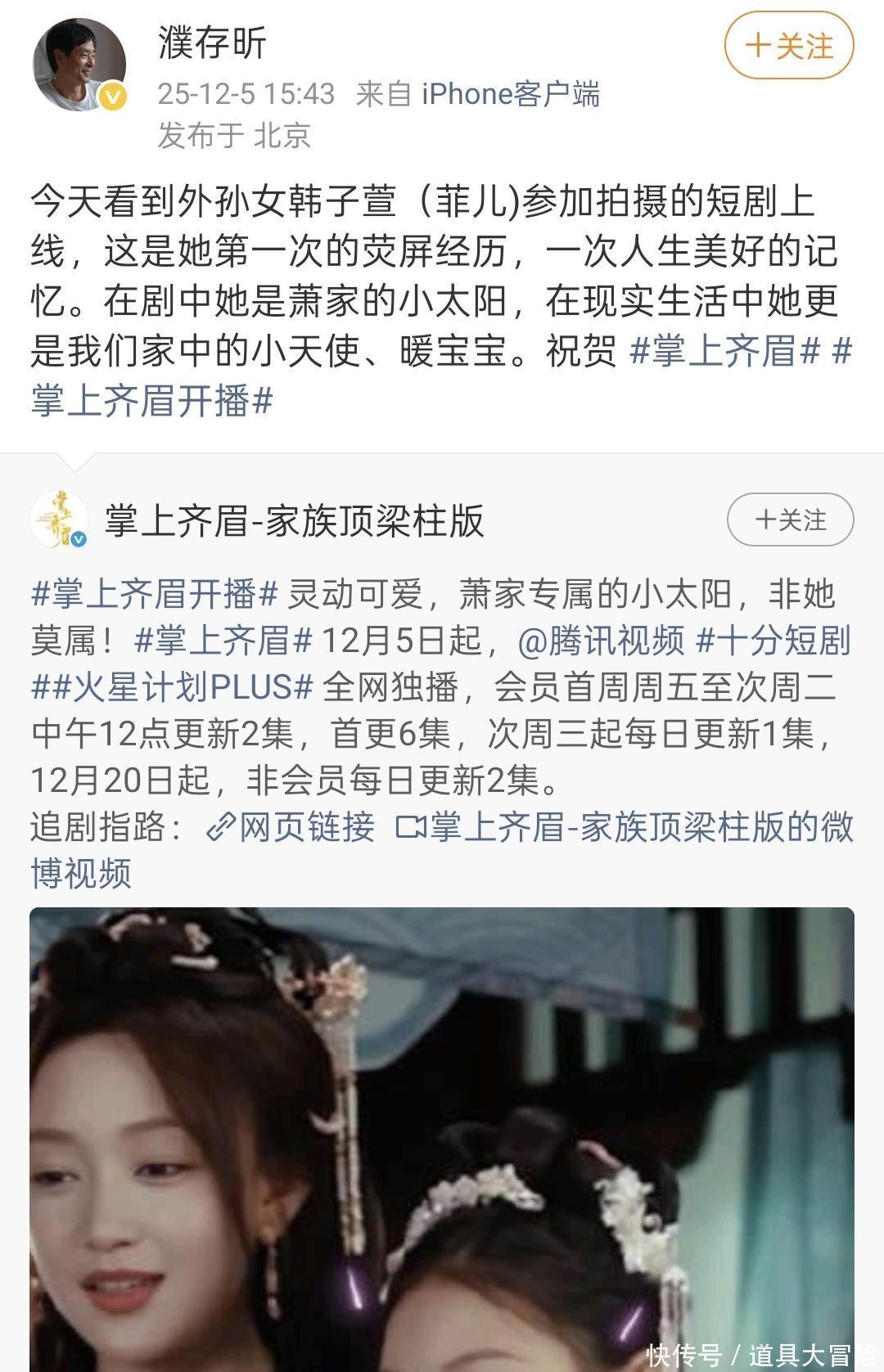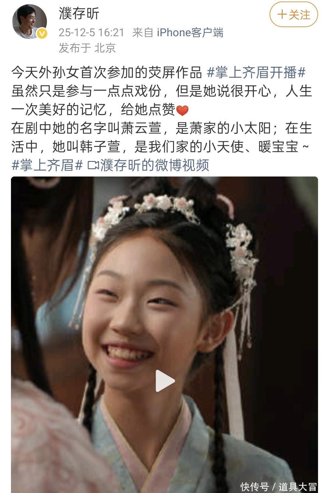 12月5日,濮存晰在社交平台上发文晒照为外孙女宣传打Call,濮存晰发文写道:“今天外孙女首次参加的荧屏作品,虽然只是参与一点点戏份,但是她说很开心,人生一次美好的记忆,给她点赞……”濮存晰的外孙女叫韩子萱,小名叫菲儿,也已经11岁了,是家里的暖宝宝、小太阳。